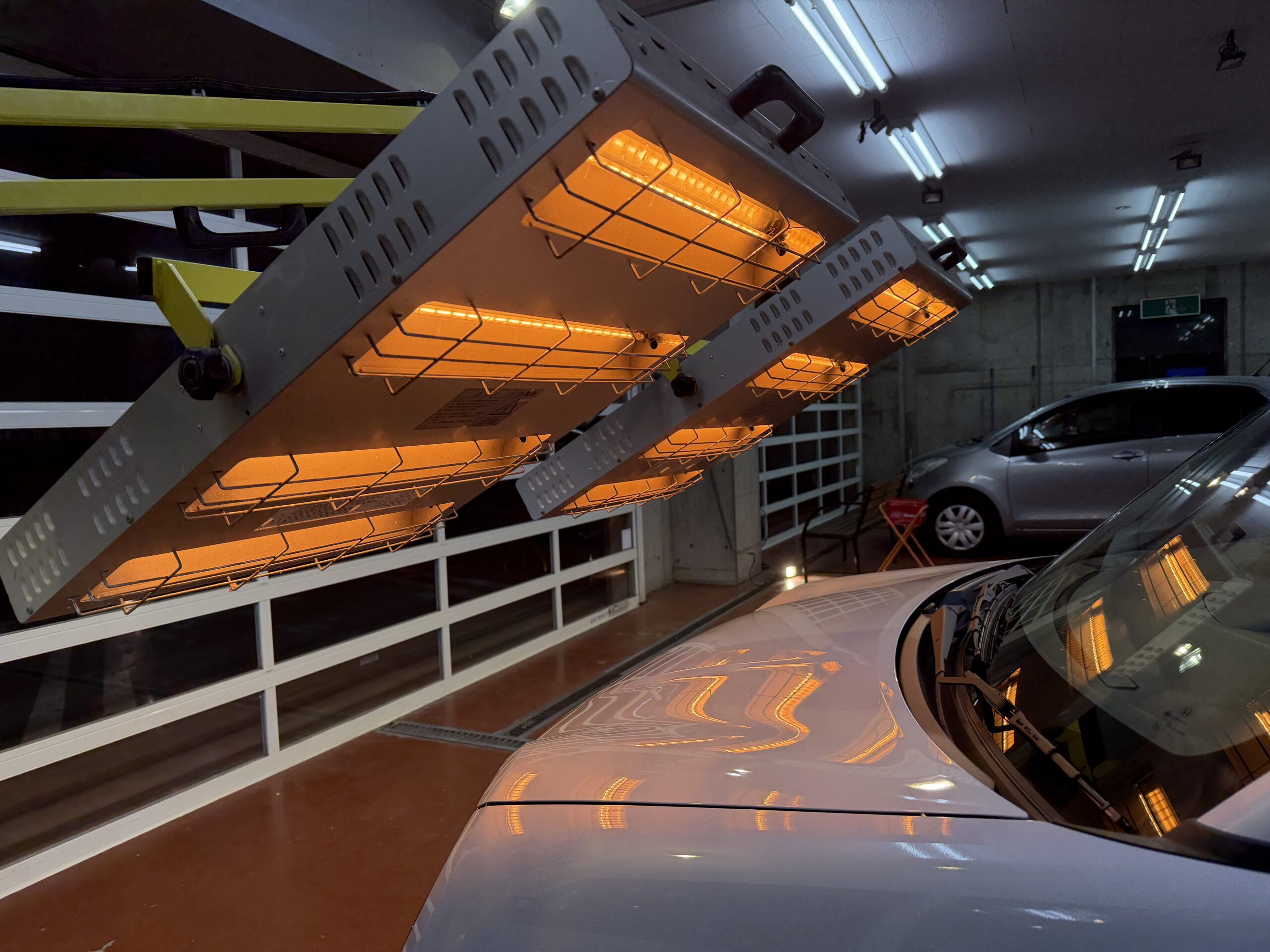 赤外線ヒーターを当てる事で納車後にすぐ洗車されても落ちることはありません。