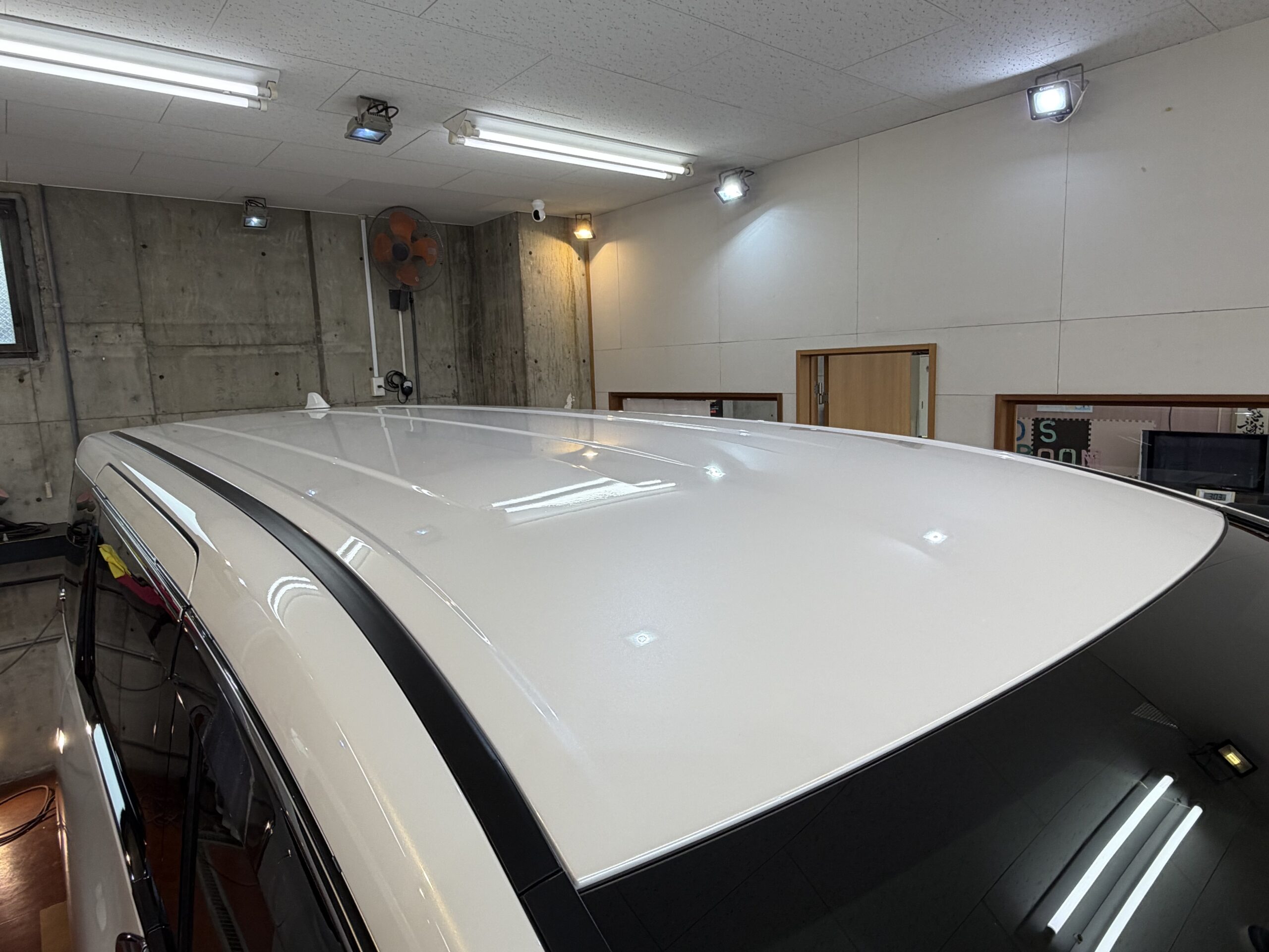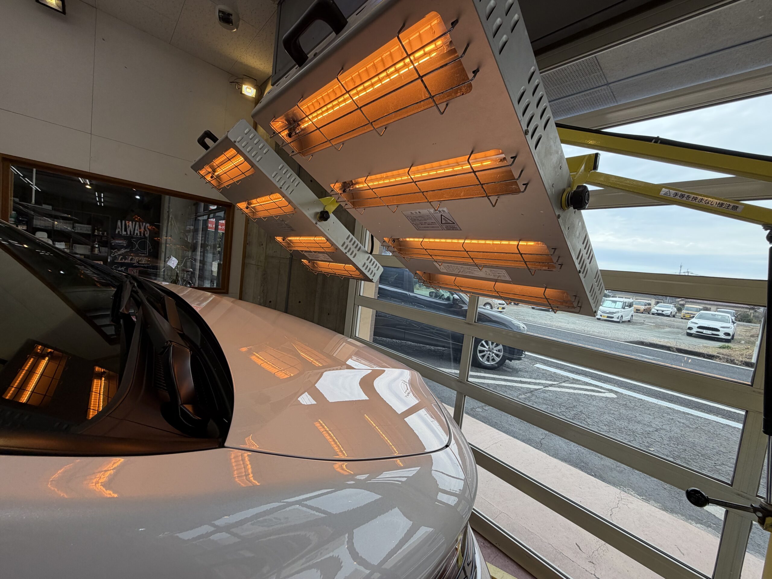 コーティング施術が完了致しましたら赤外線ヒーターをボディに当てていき、完全に固まらせていきます。