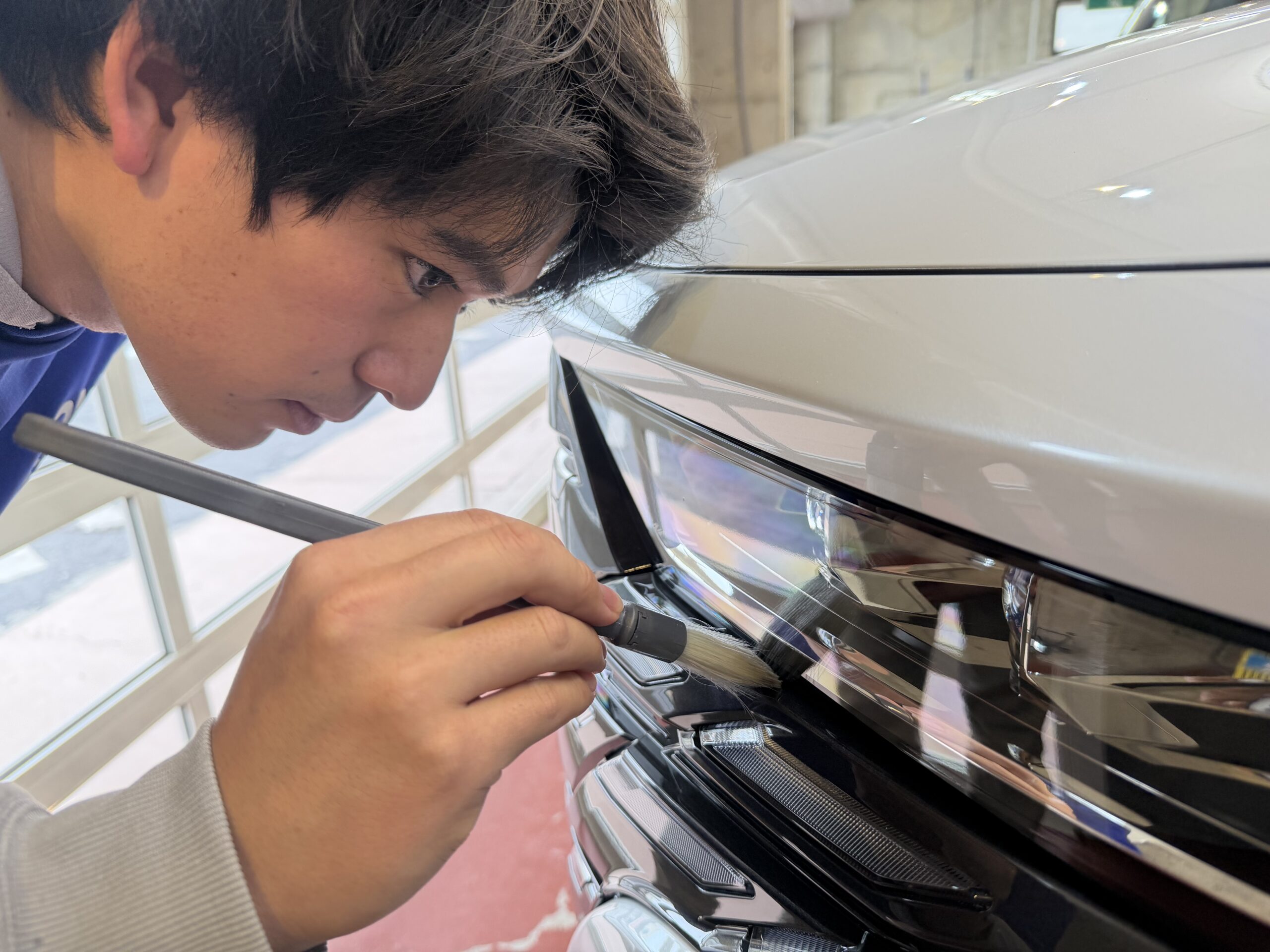 新車でも隙間に汚れが付いてたりしますのでブラシを使い綺麗に洗浄していきます。