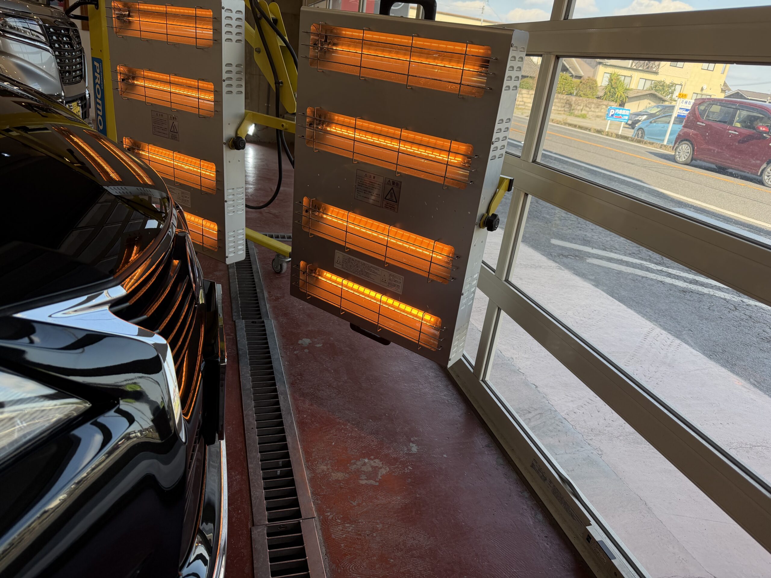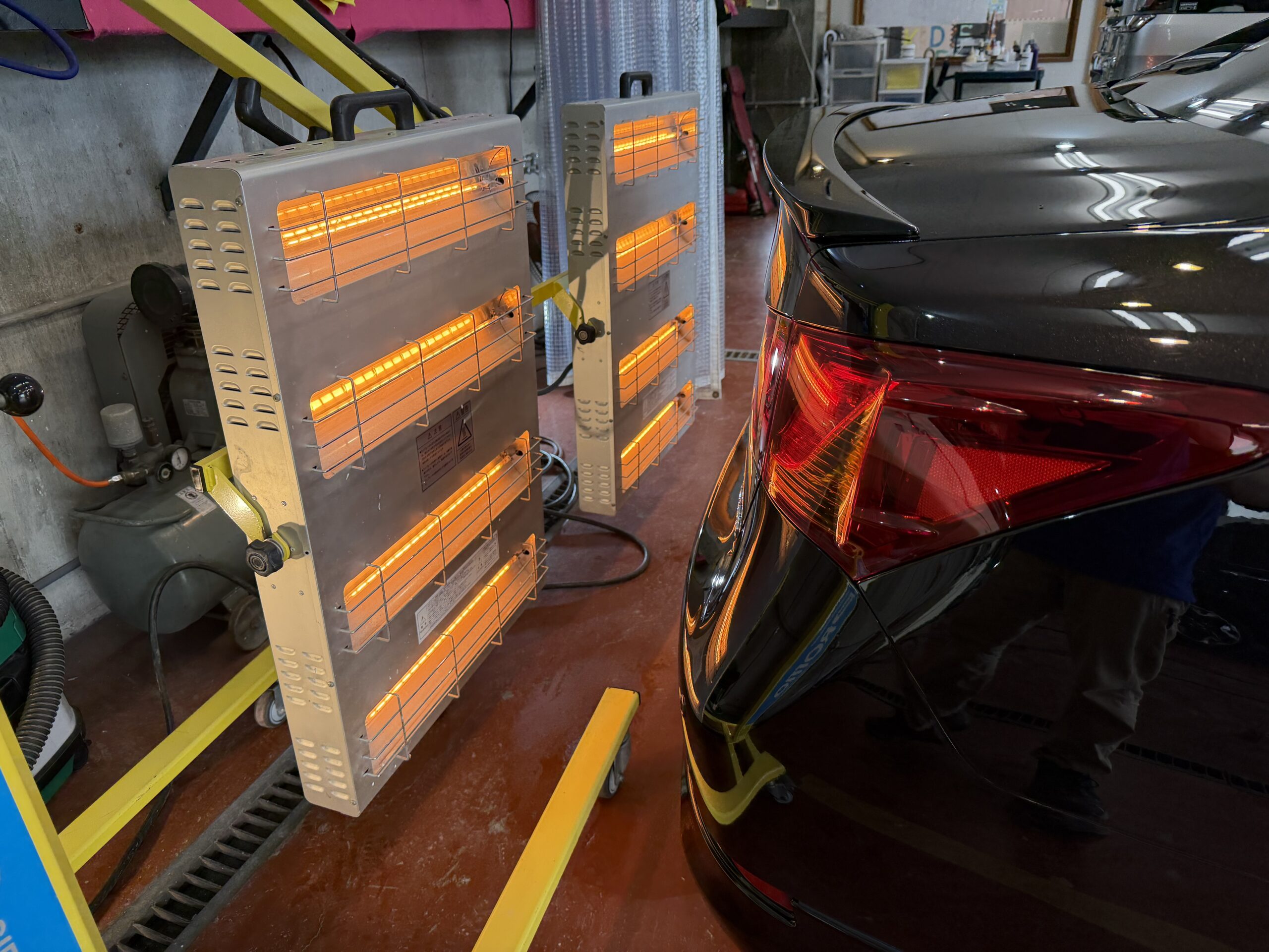 コーティング施術が完了致しましたので、赤外線ヒーターを当てコーティング剤を固まらさせていきます。