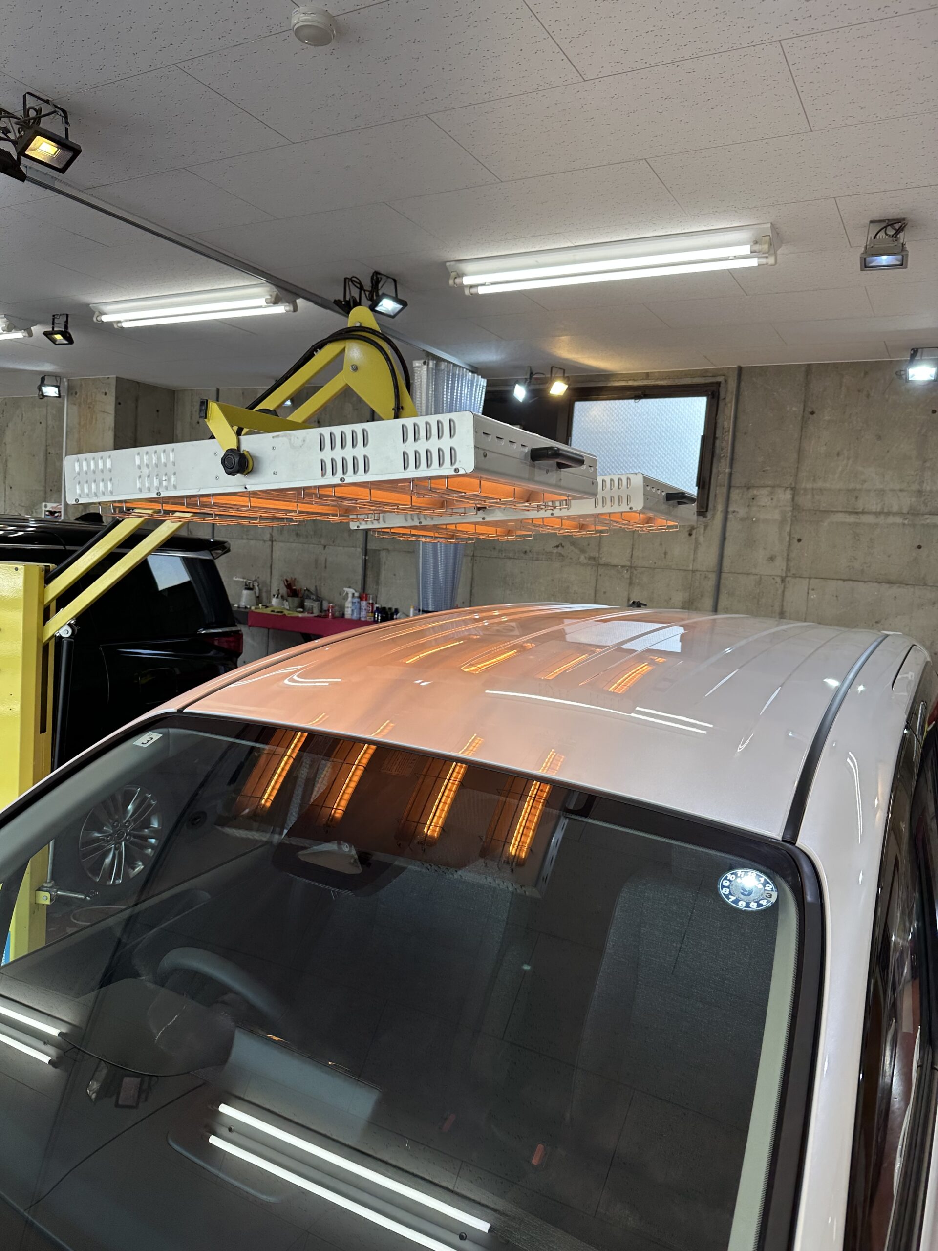 赤外線ヒーターを当て、コーティング剤を固まらせていきます。