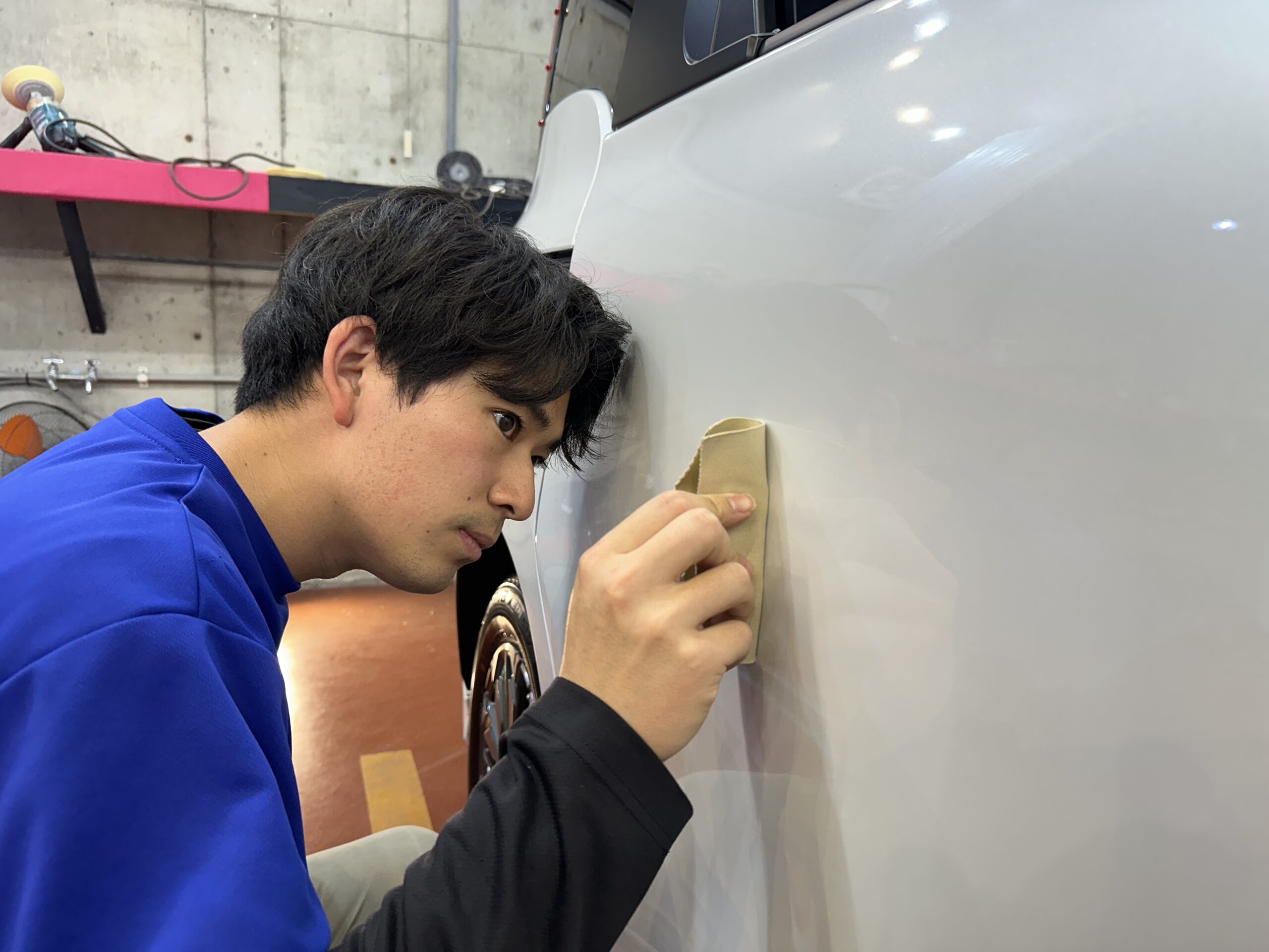 下地洗浄後、純水で流し水滴をキレイに拭きあげコーティング剤を丁寧に塗ります。