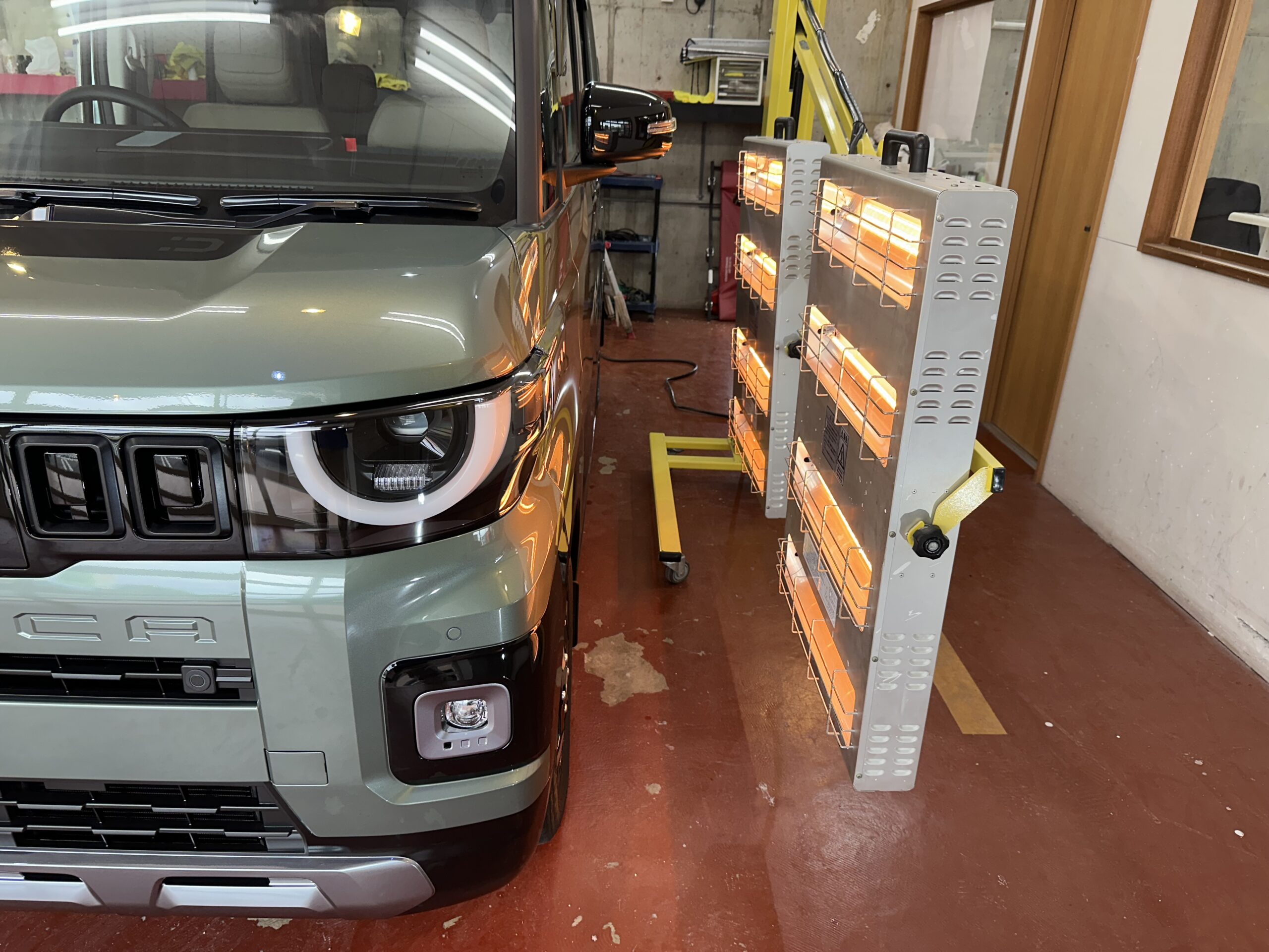 赤外線ヒーターを当て、コーティング剤を固まらせていきます。