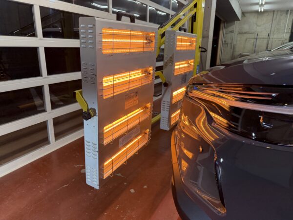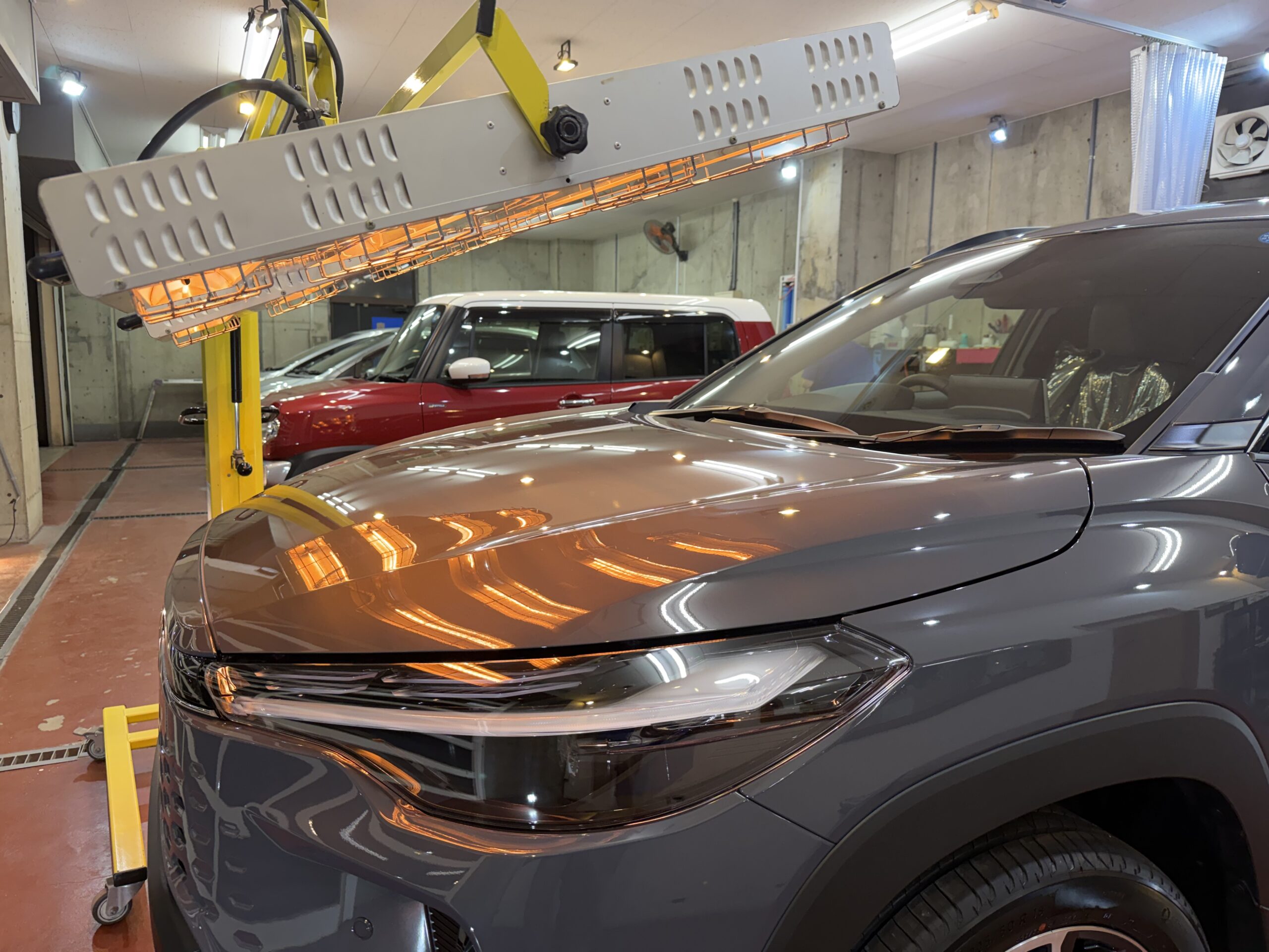コーティング施術が完了しましたら、赤外線ヒーターを当て固まらせていきます。