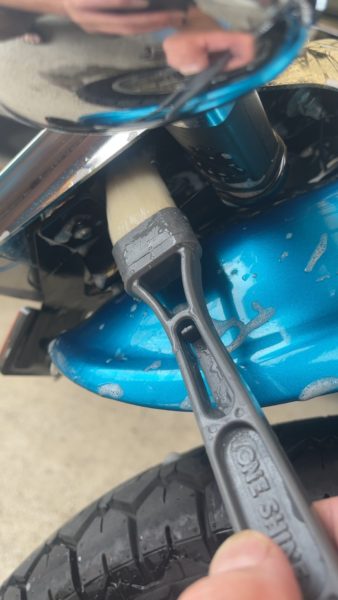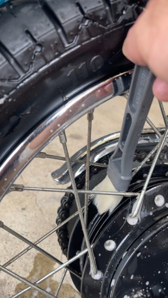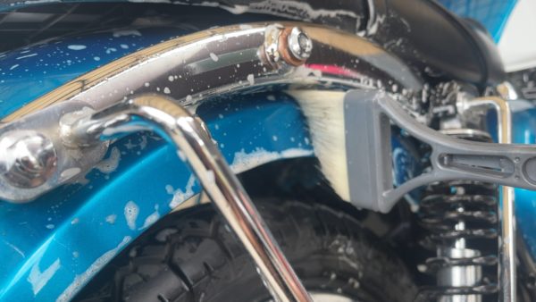 写真は、ONE SHINEブラシで細部清掃をおこなっているところ。
