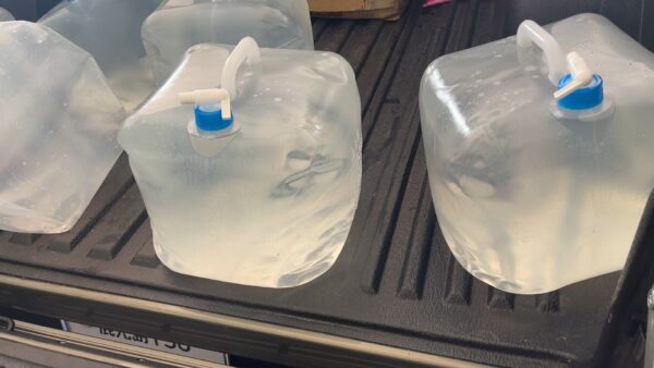 そこで、非常用のポリタンクで、水が出るレボス、カウマッチから断水中の隼人店・姶良店に”純水”を運びました。