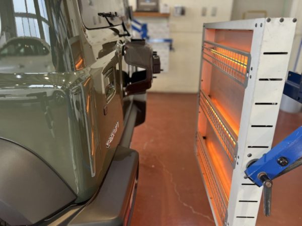 コーティングが終わりましたらボディー全体に赤外線ヒーターを当てコーティング剤をガッチリと定着させています。