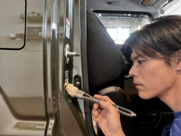 新車でもドア周りからボディー、細かところまでしっかりと溶剤を使って水垢やシミなどを落としていきます。