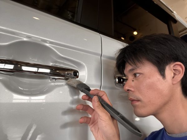 新車でもドア周りからボディー細かなところに水垢やシミなどが残っていること後ありますので溶剤を使ってきれいに水垢とシミを落としていきます。