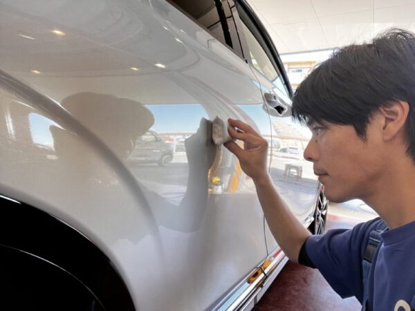 新車でも水垢やシミなどが付いていることがありますので溶剤でしっかりとおとしていきます。