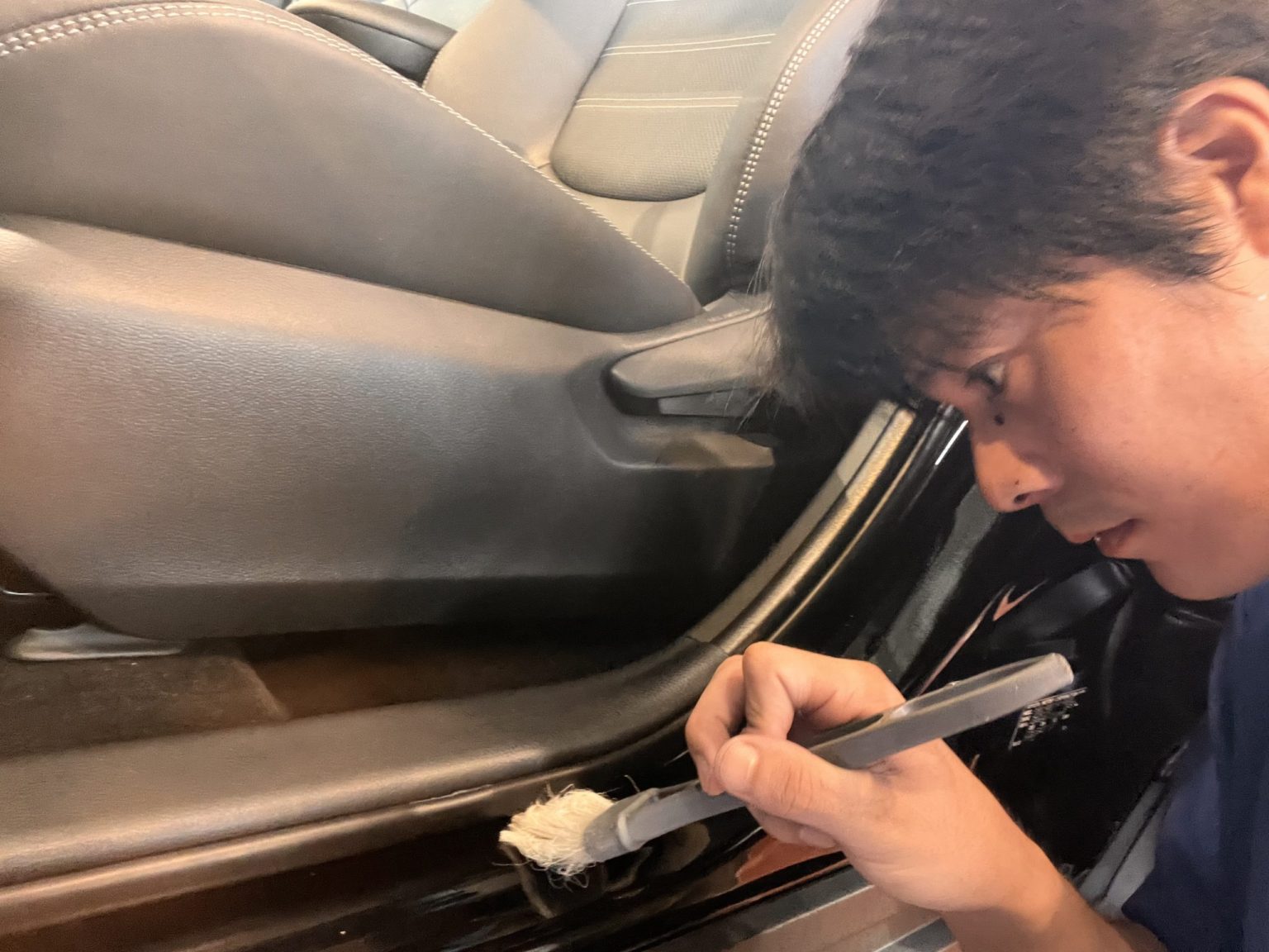 新車でも水あかやシミなどが付いていることがありますので溶剤を使って綺麗に落としていきます。