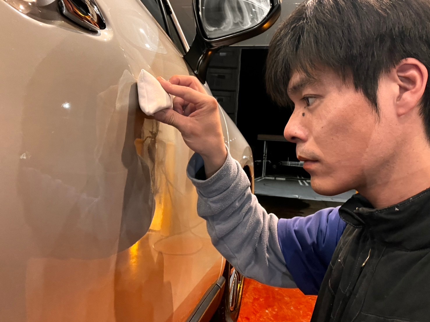 火山灰や汚れなどに負けないワンシャインコーティングを手塗りでムラなくボディーに塗り込んでいきます。