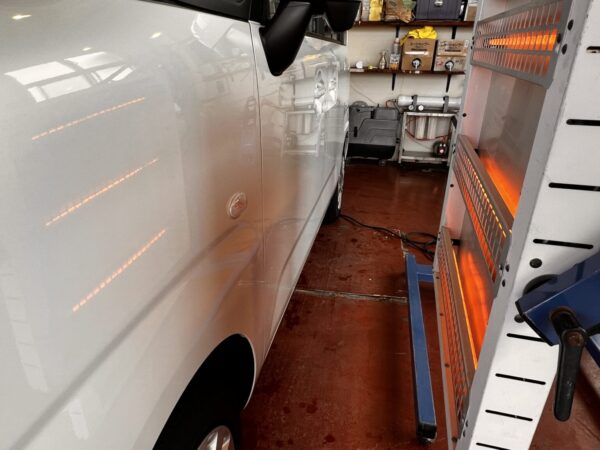 赤外線ヒーターを当てコーティング剤をガッチリとボディーに定着させていきます。