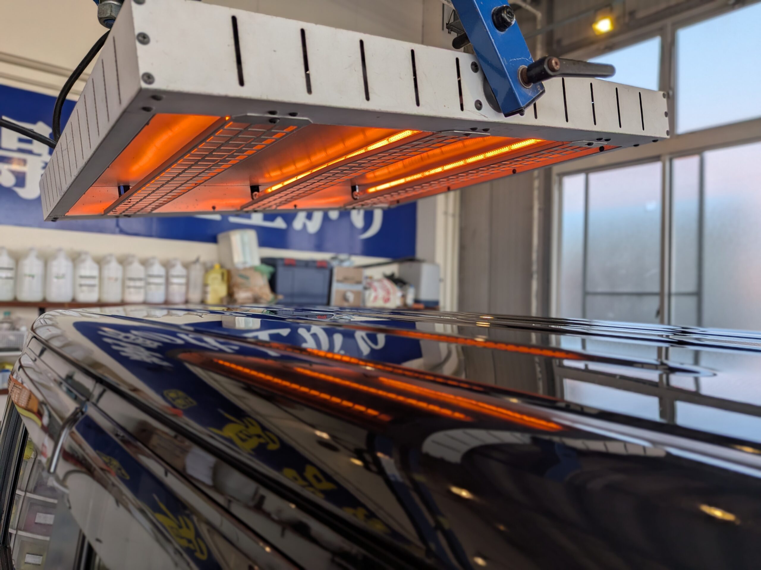 赤外線ヒーターを当てることにより、コーティングを素早くボディに定着させる事ができ尚且つ光沢を上げることができます。