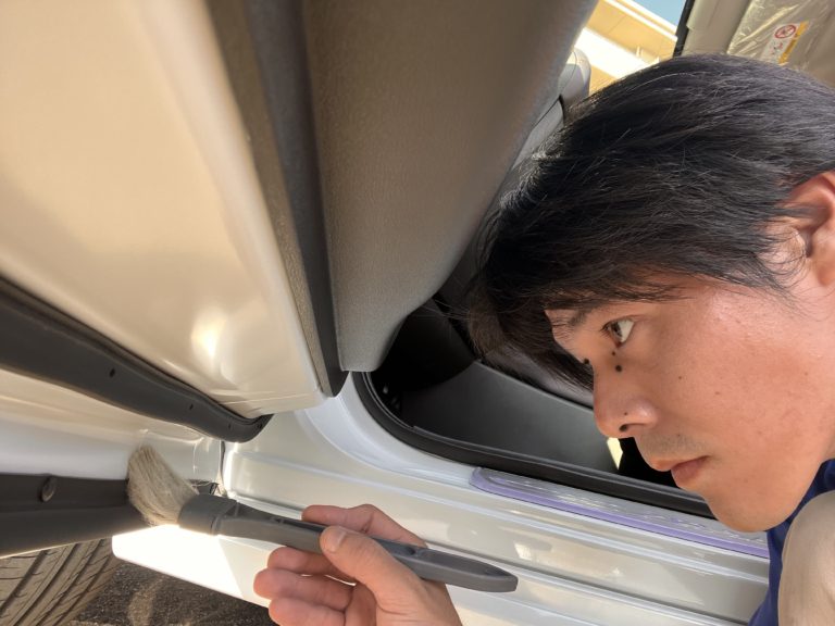 新車でもドア周りやボディーなどに水シミなどが付いていることがありますので溶剤を使って落としていきます。