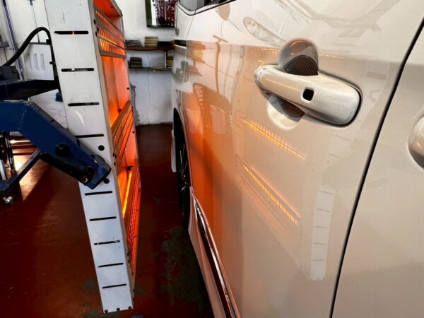 赤外線ヒーターを使ってボディーに塗り込んでいるコーティング剤をガッチリと定着させていきます