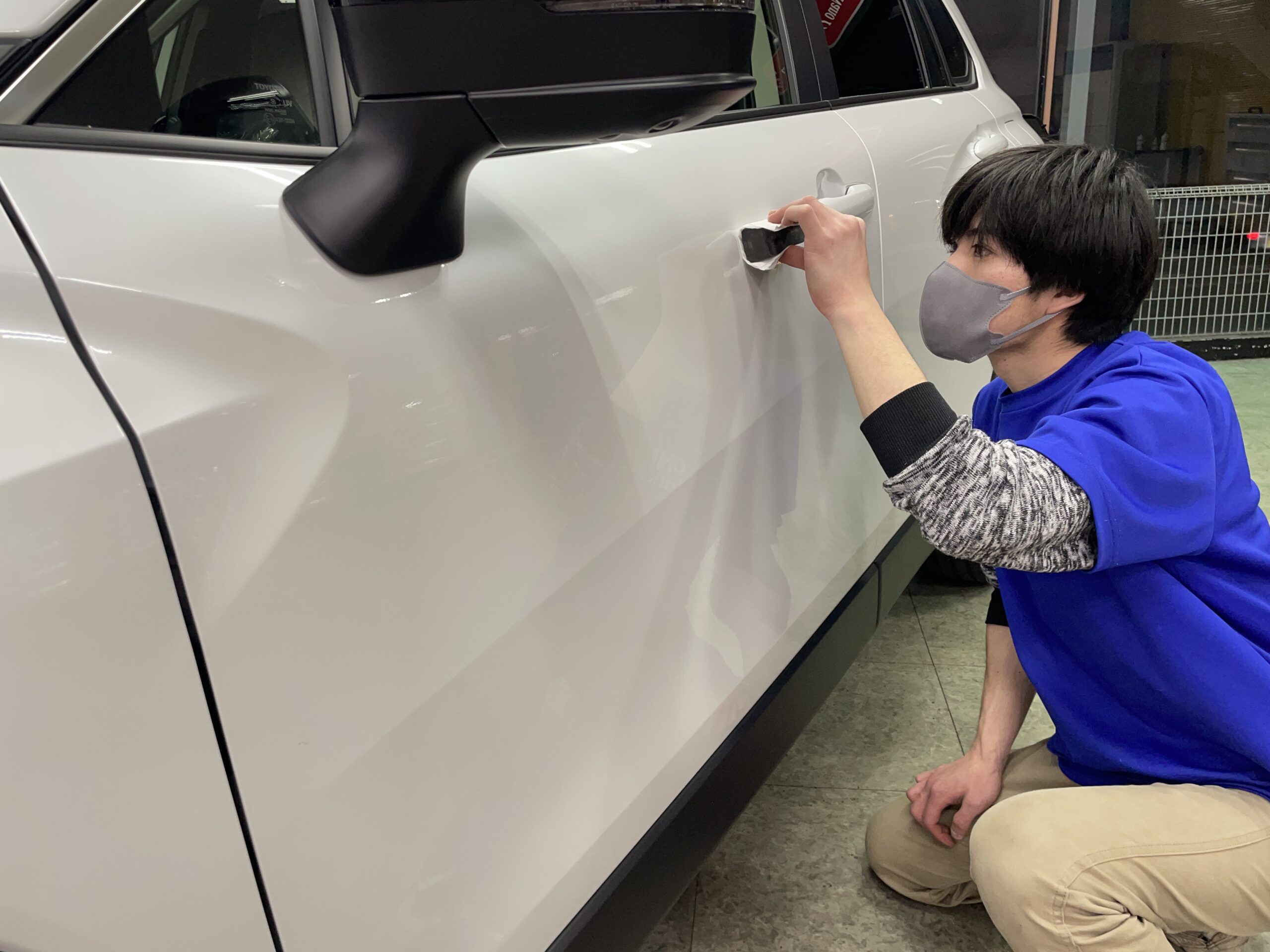 足周りが完了したら、ドア周り、細部、ボディにかけて専用の溶剤を浸け置き水垢や汚れを除去していきます。
